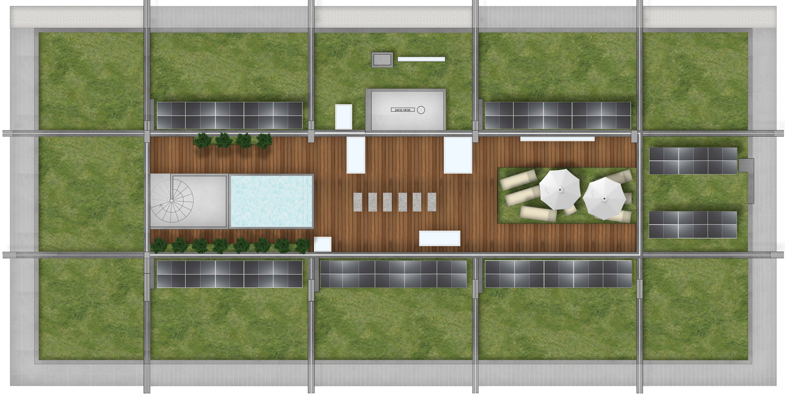 Espaços com frente integral em vidro solar e espaço exterior privado. Representam a iniciação, o recolhimento, o silêncio e o início da jornada de quem escolhe viver com luz, ma: também com paz.